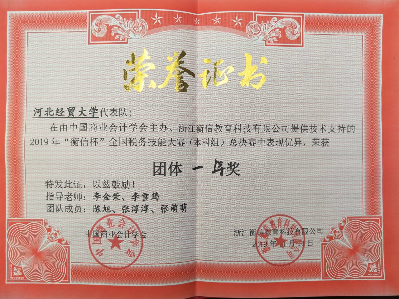 11月11—14日, 2019年“衡信杯”全国税务技能大赛总决赛在杭州举行,tyc122cc代表队在本次比赛中荣获团体一等奖,张淳淳同学获得个人三等奖。张淳淳、陈旭、张萌萌同学获得衡信科技教育有限公司免试入职通知书。李金荣老师荣获优秀指导教师称号,李雪筠老师荣获优秀带队教师称号。