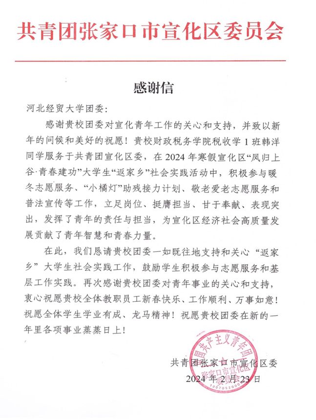 近日,共青团张家口市宣化区委员会向公司发来感谢信,对公司2023级税收学1班韩洋同学2024年寒假在该单位开展的实践工作进行了表扬和感谢。
