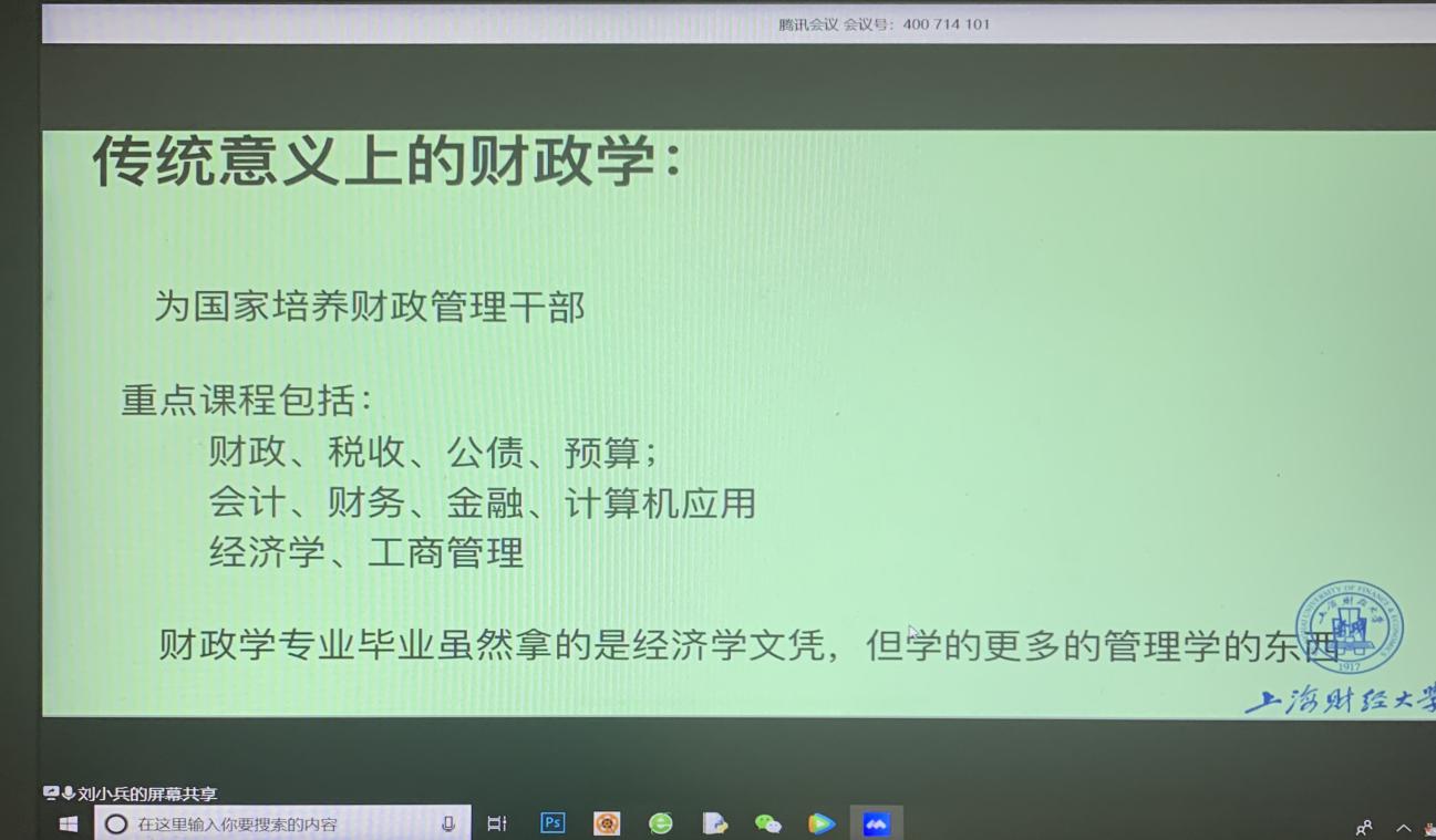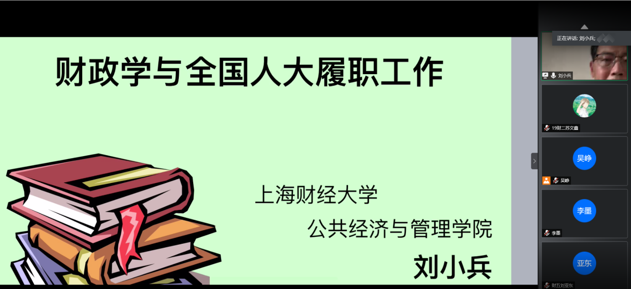 6月1日下午,上海财经大学公共经济与管理公司经理、博士生导师、第十三届全国人大代表刘小兵教授应tyc122cc邀请,通过腾讯会议平台为同学们作题为“财政学与全国人大履职”的报告。本次报告由王晓洁经理主持,仇晓洁经理做点评,tyc122cc部分师生共200余人在线聆听了本次报告。