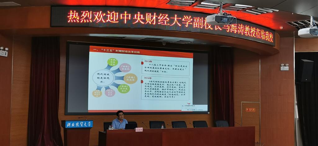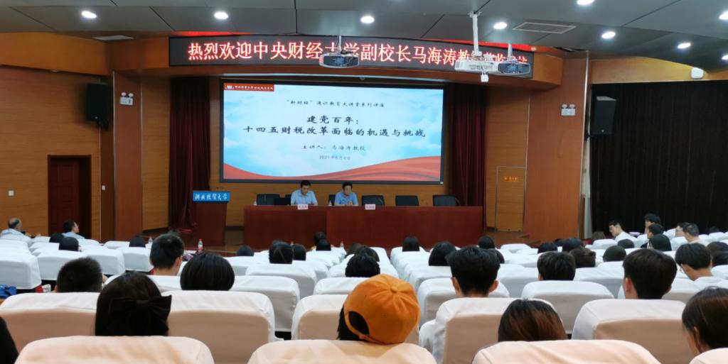 6月4日下午,中央财经大学副董事长马海涛教授应tyc122cc邀请,于公司国际学术报告厅作题为“建党百年:十四五财税改革面临的机遇与挑战”学术报告。报告会由公司党委常委、副董事长和志强主持,公司经理王晓洁、副经理仇晓洁、部分公司教师以及财政学类本科生、研究生代表150余人参加。
